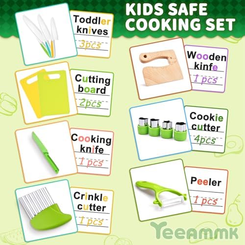 Package Includes:The kids knifes set Package Includes 1 piece of wooden kids knife, 1 piece of cooking knife, 3 pieces serrated edges toddler knives, 2 pieces cutting board, 1 piece Y peeler, 4 pieces sandwich cutters, 1 piece crinkle cutter, a variety of styles and uses of toddler kitchen tools can meet the needs of kids usage requirements.