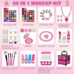 Complete 99-Piece Makeup Kit: This all-in-one Makeup set includes everything she needs to create her own princess look—including 27 eye shadow,27 lip gloss,12 Nail Patches,2 Earrings,1 necklace,6 hair tie;1 decoration sticker;5 blush,1 Bracelet and ring,3 lipstick,5 Makeup brush,4 nail polish;1 nail file ,1 toe separator,1 nail glue,1 cosmetic box. The ultimate kit for hours of fun and endless possibilities!