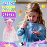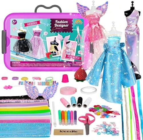 Complete Kids sewing set: Better quantity and more variety. You can use needle to create your own fashion costumes or choose no-sew mode for young kids. Includes – mannequins, sketch sheets, 24 fabric sheets, lace trims and ribbons, 4 colors of thread, sewing needles, tape measure, chalk pencil, 6 makers, scissors, thimble, bows and flowers, rhinestones, double-sided tape, elastic bands, needle threader, pincushion, wings and instruction, storage box.