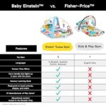 Compose the perfect play time for baby with the best-selling Baby Einstein 4-in-1 Kickin’ Tunes Music & Language Discovery Gym. With hundreds of thousands of units sold, this musical activity gym engages baby with 25+ minutes of continuous lights and music and transforms 4 ways to grow with baby from ages 0 to 36 months. A must have for any baby registry with 4 play modes: lay and play, tummy time, seated play, and on the go. Baby will love to explore the gym’s 2 toy bars and the colorful kick piano, which features 3 modes of learning and play. As baby grows, flip the piano up to use for seated play, or detach from the gym to take musical discovery on the go! A Magic Touch surface helps the piano respond to every kick, tap, and press so baby can make music easily! Parents love that this unique gym supports baby’s visual development and fine and gross motor skills. The piano features 70+ engaging melodies and sounds and teaches colors, shapes, and numbers in 4 languages (English, Spanish, French, & German). 7 detachable toys encourage reaching and sensory engagement, and a prop pillow gives baby extra support to help baby strengthen neck muscles during tummy time.