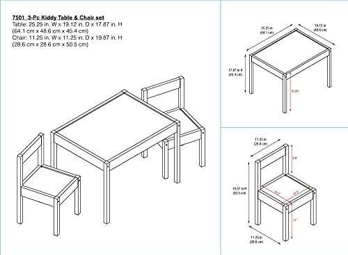 Table dimensions: 25.25″L x 19.12″W x 17.87″H. Chair dimensions: 11.25″L x 11.25″W x 19.87″H. Seat dimensions: 9.5″D x 9.5″W x 11″H. Table and chairs for kids. Childrens table and chair set net weight: 13.22 lbs.