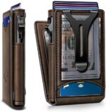 CAPACITY-Pop-up metal Case in flipping leather shell,9 card slots (including 1 ID window) and metal money clip for couple of bills;