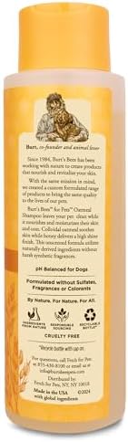 Instantly calm your pet’s discomfort with our skin soothing dog shampoo. This Burt’s Bees Oatmeal Dog Shampoo relieves irritation from allergies, making it the perfect anti itch shampoo for dogs and a top dog shampoo for dry itchy skin. Featuring colloidal oat flour to moisturize and honey to add softness, this moisturizing dog shampoo gently cleanses. It’s the burt bees oatmeal dog shampoo that leaves your pet’s coat clean, soft, and healthy-looking from the first wash. Our oatmeal shampoo for dogs is pH balanced for a dog’s delicate skin. This gentle dog shampoo is made without sulfates or parabens, making it an ideal choice for dogs with sensitive skin. A truly mild dog soap for your pet. Make bath time a breeze with our easy-rinse, low-lather dog wash. This formula cleans effectively without excessive suds, rinsing away quickly to save you time. An essential item for your dog bathing supplies and any dog grooming kit. Go beyond cleaning with this premium dog soap. It acts as a dog conditioner, nourishing skin and fur to leave your dog’s coat incredibly soft and manageable. A dog shampoo and conditioner in one that simplifies your grooming routine. Gentle enough for your newest family member, this puppy shampoo is a perfect addition to your new puppy kit. The mild formula is safe for all dogs, providing a soothing bath from their first wash to their senior years. A trusted choice for all dogs. This versatile pet wash is a complete dog dry skin care solution. It addresses dog dandruff and irritation, making it a superior dog itchy skin treatment. A great dog shampoo for smelly dogs that also provides deep, moisturizing care. Choose the trusted quality of burt’s bees for dogs. This burt and bee dog shampoo comes in a bottle made from 80% post-consumer recycled materials. Give your best friend the gift of a comfortable, clean, and soft coat with this pet shampoo.
