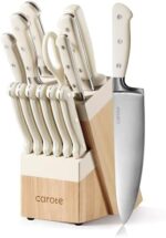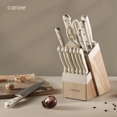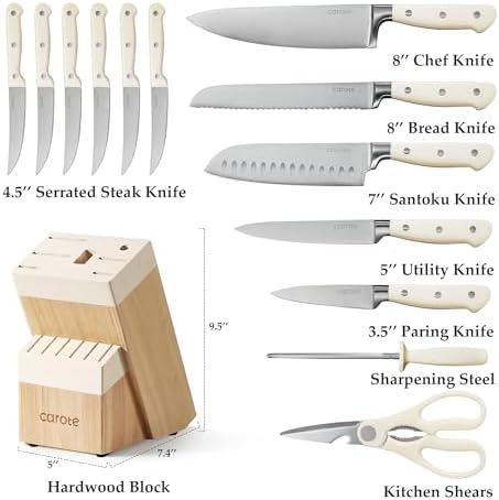 CAROTE Knife Set with Block includes all the most common kitchen knives, 8″ chef knife, 8″ bread knife, 7″ santoku knife, 5″ utility knife, 3.5″paring knife, as well as a six-piece steak knife set, kitchen shears, sharpening steel, 14-slot hardwood storage block with nonslip feet.