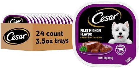 This Cesar dog food shows that the best way to show your dog love is by keeping them happy and healthy with gourmet meals. With real meat as the #1 ingredient, Cesar Classic Loaf in Sauce Wet Dog Food Filet Mignon Flavor features high-quality protein and nutrition that is slow-cooked for great taste. This product contains no fillers, added sugar, or artificial flavors; ingredients are natural as defined by the Association of American Feed Control Officials (AAFCO). Cesar Classic Loaf in Sauce is easy to digest, but hard for your dog to resist. Made in the USA with the finest ingredients from around the world, dog owners can be sure your best friend is getting a meal that is 100% complete and balanced for adult dogs. This small breed wet dog food comes in convenient trays with easy peel-away seals, making serving simple for pet parents who want a balanced diet and convenience. Delicious and healthy meals for everyday enjoyment and pet care with Cesar Classic Loaf in Sauce Filet Mignon Flavor, a trusted soft dog food for discerning companions.