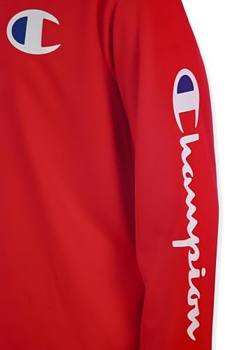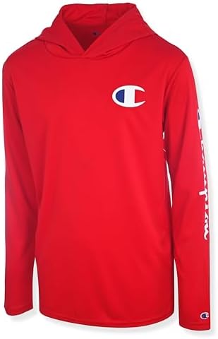 This Champion boys long sleeve hooded tee blends the comfort of a t-shirt with the coverage of a hoodie, making it the perfect lightweight layer for school, play, or lounging. Crafted from 100% polyester performance tech fabric, this boys hooded tee shirt delivers breathable comfort with moisture-wicking durability. Designed with long sleeves and a relaxed pullover fit, it features bold Champion logos on the chest and down the arm for an athletic, standout look. Whether worn on its own in warmer months or layered under a jacket in cooler weather, this hooded long sleeve tee is a versatile must-have for any boy’s wardrobe. Available in core colors like black, grey heather, lychee, and white, this machine-washable top is built to move with him from the playground to the couch and everywhere in between.