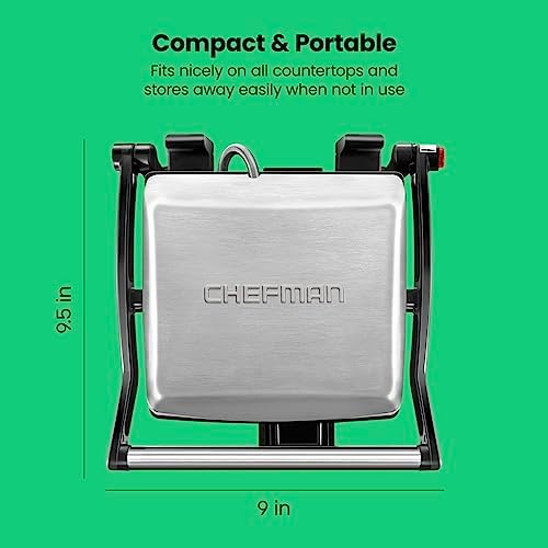 A Bistro in your own kitchen! When it comes to making a memorable meal, it’s all about the flavor and details – from the gooey, melted cheese to the crusty, warmed bread with those enticing grill marks. With the Chefman Panini Press Grill and gourmet sandwich maker, you can make perfectly pressed Panini’s right at home. The floating hinge adjusts to press the thinnest grilled cheese to the most stuffed burgers. You aren’t just limited to sandwiches and Panini’s – this grill accommodates all varieties of delicious food. There’s no limit to your cooking creativity! Need to grill steak? Open the grill to lay flat at 180° with just the push of a button. The closed cooking surface is making it ideal for four sandwiches or 2 Panini’s, while lay-flat surface is stellar for grilling burgers, fish, chicken, vegetables and more! Clean-up is just as quick and easy with its sloped design so grease drips to the back. The removable drip tray and non-stick plates make it easy to remove excess food and grease. Its compact size takes up little counter or shelf space making storing your contact grill easy and makes this an ideal appliance for small kitchen spaces, dorm rooms, offices, and even bringing on Road trips! With the Chefman Panini Press Grill and gourmet sandwich maker you can make tasty sandwiches, grilled dishes and more right in the Comfort of your own home without breaking a sweat! No master sandwich maker skills required. Closed cooking surface of 5.5 x 8.75 inches is ideal for two sandwiches.