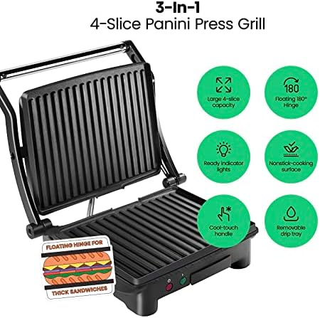 HUNGRY FOR A SANDWICH? With just the push of a button, this 4 Slice Grill-Panini Press Combo can be used to press your custom sandwich or open at 180 degrees for grilling burgers, steaks, veggies and anything else you’re craving quickly and easily! Use it as a panini press for perfectly crisped bread- no cooking spray required.