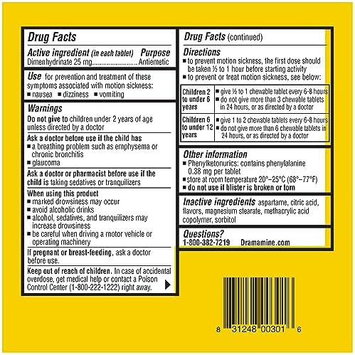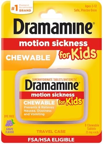 Get powerful, fast relief from the number one pharmacist-recommended brand,* in a safe, precise dose just for kids! Dramamine Motion Sickness for Kids is the only medicated motion sickness relief product formulated for children, ages 2-12. Dramamine for Kids prevents and relieves nausea, dizziness and vomiting and treats motion sickness symptoms on the spot with a dye free, fun grape flavored chewable tablet that is lactose free. Motion sickness can affect many children, commonly on road trips, theme park visits and cruise vacations. Plan ahead and be prepared with Dramamine for Kids. The convenient Travel Case makes it easy to take along in your bag or backpack with your other vacation essentials or for any adventure. Dramamine fits with your other travel size toiletries and travel must haves. Don’t forget your other family members and consider picking up a Dramamine Motion Sickness or Nausea product. If you know your family is going on an adventure that is likely to cause motion sickness, have your child take Dramamine for Kids BEFORE the trek. Take Dramamine and Take Control. See packaging for dosing instructions and warnings. *Named by Pharmacy Times and U.S. News & World Report as number 1 Pharmacist-Recommended Brand for 2025 Motion Sickness Remedies Category.