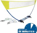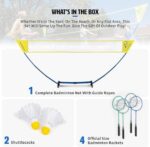 HIGH-QUALITY SPORTS EQUIPMENT – Includes (1) 5ft badminton net and pole system, (4) official size badminton rackets with tempered steel shafts, grommets, and cushion grips, (2) white badminton shuttlecocks, and (1) set of game rules.