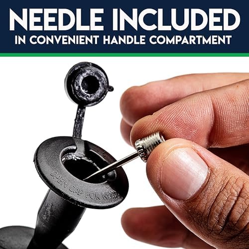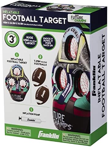SET INCLUDES: (1) 45” inflatable 3-hole football target with water-fillable base, (2) 7.25” rotationally molded PVC footballs, (1) sports ball hand air pump with needle
