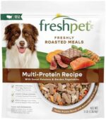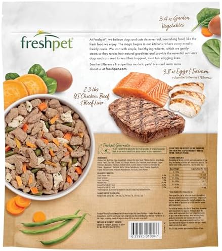 At Freshpet, we believe pets deserve real, nourishing meals made from fresh, wholesome ingredients-just like the food we enjoy. Fresh from the fridge our Multi-Protein: Chicken, Beef, Egg & Salmon Recipe Freshly Roasted Meals is packed with premium proteins like US farm-raised chicken, beef, and salmon to fuel your pet and support healthy coats and soft skin. Gently steam-cooked to retain essential nutrients and complemented by antioxidant-rich sweet potatoes & nutrient-dense carrots and green beans, this recipe is conveniently packaged in a resealable bag. It’s the next best thing to a homemade meal for your dog! Pets, People, and the Planet are central to everything we do at Freshpet®. Our mission is to bring fresh, real food to pets, helping them live their longest, happiest, and healthiest lives. We use simple, healthy ingredients, gently steaming each meal to retain its natural goodness and provide essential nutrients the essential nutrients dogs and cats need to lead their happiest, most tail-wagging lives.