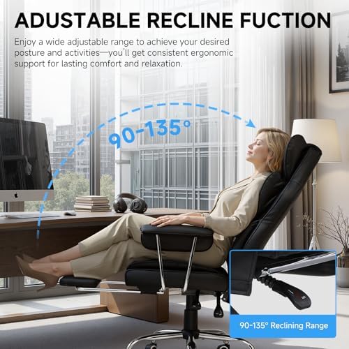 【Suitable for All】 This computer chair offers a 10cm height adjustment, catering to individuals of varying heights (5’1″ to 6’2″). With a flexible recline ranging from 90° to 135°, it accommodates various activities like work, reading, entertainment, and relaxation. The 360° swivel seat and multi-direction casters allow free gliding and sliding.