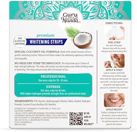 Reveal a brighter smile with GuruNanda Teeth Whitening Strips. Our dry-strip formula combines hydrogen peroxide with soothing coconut extracts, helping to break down stains & whiten teeth.