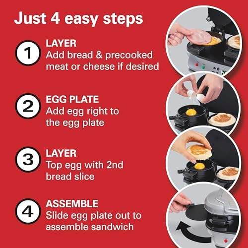 Forget the fast food drive-through. With the Hamilton Beach Breakfast Sandwich Maker, you can enjoy a hot, homemade breakfast sandwich in under 5 minutes. Simply place the ingredients inside, build the base of your sandwich in the bottom layer, place the egg on the cooking plate and close the lid. Slide the cooking plate out and your sandwich assembles itself. Open the lid and your hot breakfast sandwich is ready to eat. The included recipe book provides a variety of breakfast sandwich options, from the traditional egg, ham and cheese to the unique cheddar, apple, bacon and egg croissant sandwich.
