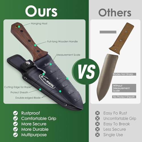 Premium: Full length 12.1 inches, 7 inches blade. Made of high-grade stainless steel with rust-proof blades that extend into a full tang for superb strength. The garden knife is sturdy and will hold up under intense work.
