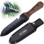 Multifunction Blade: Features a sharp edge for slicing and a serrated edge for cutting tough roots. The curved blade and depth measurement in inches make planting a breeze. The cord-cutting edge also acts as a bottle opener. With so many uses, this knife is a good pick for a range of outdoor activities, including gardening, fishing, and camping.