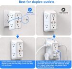 【10 IN 1 Function USB Wall Outlet】This wall plug extender comes with 6 AC outlets, 2 USB A ports and 2 USB C port. Fits duplex outlet perfectly, just plug in to use. The screw port helps hold the surge protector power strip tightly to the plug. Please note: For some outlets, the white plastic prong can be cut off before using.