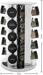 Enhance your kitchen organization with this Kamenstein 20-Jar Stainless Steel Revolving Spice Rack for the countertop. Made of stainless steel, this rotating spice rack holds 20 jars that come filled with frequently used spices. Jars included in the spice organizer are made of glass with clearly labeled black caps that feature sifter tops for easy, mess-free dispensing when seasoning foods. Spices included in your spice rack may include basil, marjoram, garlic salt, coriander, rosemary, oregano, and more. Each jar is filled and sealed in our Massachusetts spice-bottling facility. This product is eligible for 5 years of free spice refills. Measures 13-1/2 x 8-1/2 x 8-1/2 inches. Wipe clean with a slightly dampened cloth or paper towel. Do not immerse in water.