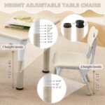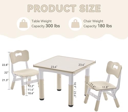 【Height Adjustable Table & Chairs】: 7 height levels for the table from 18.9″ to 23.6″ plus a foot spinner to cope with uneven ground, 3 height levels for the chair seat from 10.6″ to 12.2″. Table top: 23.6″x23.6″, Maximum weight capacity of table: 300lb, maximum weight capacity of chair: 180lb.