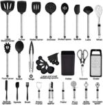 33 COOKING UTENSILS – Utensil Set includes everything you need to cook that perfect dish,includes Slotted Spatula ,Slotted Spoon,Flexible Spatula,Slotted Turner, Solid Turner, Pasta Server,Solid Spoon, Kitchen Tongs, Draining Spoon, Whisk ,Deep Soup Ladle,Spatulas,Brush,Peeler,Pizza Cutter,Bottle Opener,Potato,Pusher,Ice-cream spoon,Can opener,Grater,Scissors,measuring cups and spoons set,Small Brush,,Small spatula,Spatula,Holder