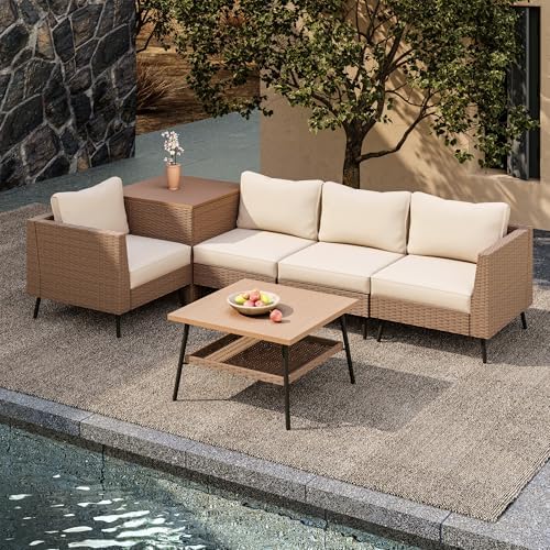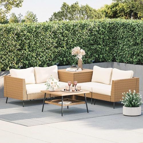 【Shipping and Warranty】This outdoor conversation set comes in 3 boxes and may arrive at different times. It includes 2 Armless Chairs, 2 Corner Chairs, 1 Storage Box and 1 Coffee Table. Additionally, a 1-year warranty will be provided by the manufacturer. Please feel free to contact us if you have any other questions.