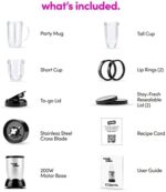Included: (1) 250W motor base, (1) cross-blade, (1) tall cup, (1) short cup, (1) party mug, (2) lip rings, (2) Stay-Fresh resealable lids, (1) to-go lid and 10-second recipe guide.