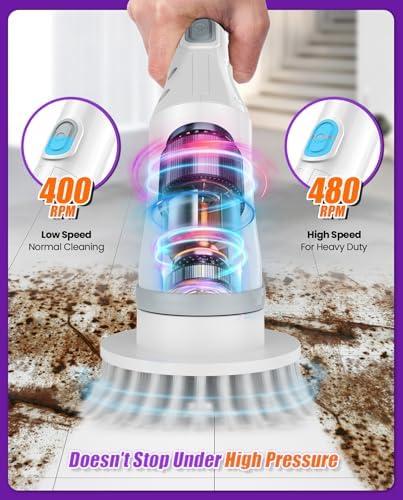 Upgrade Rotary Floor Brushes: Equipped with a powerful 25W motor, which can operate firmly even with high pressure and the working noise is under 50 dB. It also has 2 working speeds: 400RPM for daily cleaning and 480RPM for deep clean.