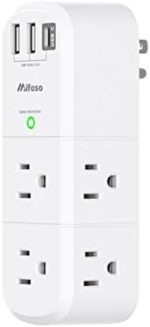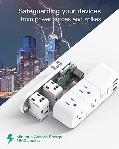 【9 IN 1 Function USB Wall Outlet】- 6 AC outlet splitter (3 side, 15A/125V/1875W) with built-in 1800 Joules surge protector and 3 USB charging ports (1 USB C, total output DC 5V/3.1A), 180 degree rotating AC plug. The grounded indicator light that assures your devices are secure.