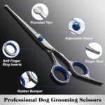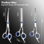 【Safe Design】All dog scissors are designed with Round Tips,so you don’t have to worry about poking your pet’s skin . A silencer between the handles reduces noise from stainless steel contact during trimming, preventing pets from becoming frightened and making grooming more enjoyable. Warm Note: The curved dog grooming scissors’ blade design prioritizes efficiency (Quick Contouring), making them ideal for sensitive areas (face, neck, ears, abdomen, rear, paws, etc.)
