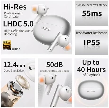 realme Air 6 True Wireless Earbuds, 50dB Active Noise Reduction, Hi-Res Sound, LHDC, 12.4mm Dynamic Bass Driver, 6 Mics Clear Call, 40H Battery, Bluetooth 5.3, IP55 Water Resistance