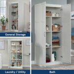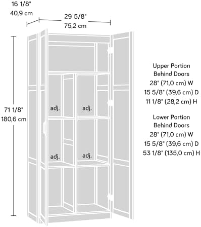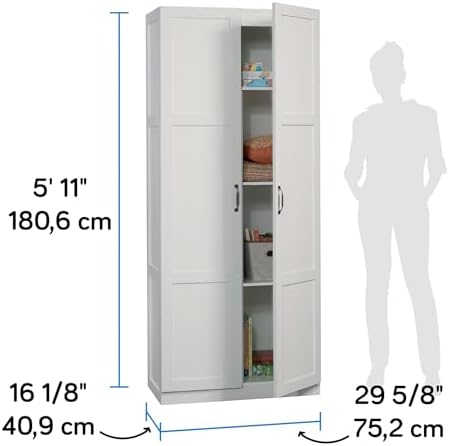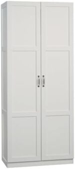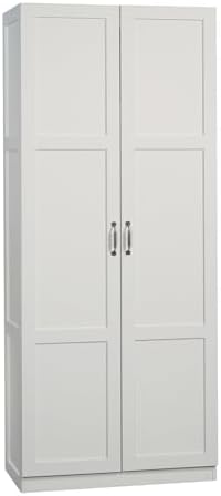 Need some extra storage in your life? This storage cabinet from the Sauder Select collection features four adjustable shelves and a full-width upper shelf so you can stash bins, blankets, pantry items and more. This storage cabinet with doors offers the perfect amount of style and practicality for any room in your home. Finished in a sleek White and detailed with frame and panel doors and sides, this tall cabinet is ideal for the kitchen, basement, garage, or anywhere you need a storage solution. We hope you like what you see. Sauder designers travel the world and bring back the best and latest in style, finish, and color trends. This inspiring world travel is evident in the cutting edge and innovative furniture solutions we offer to you!