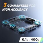 Three Guarantees for High Accuracy: This ultra-precision body fat scale, adopting the advanced BIA technology, is equipped with 4 high sensitive electrodes and 4 high precision G-shape sensors that have passed 100,000 times sensor performance tests to enhance accuracy.The scale ensures accurate measurement results to within 0.2lb/100g and has a maximum weight capacity of 400lb/180kg.