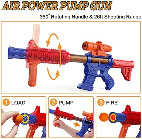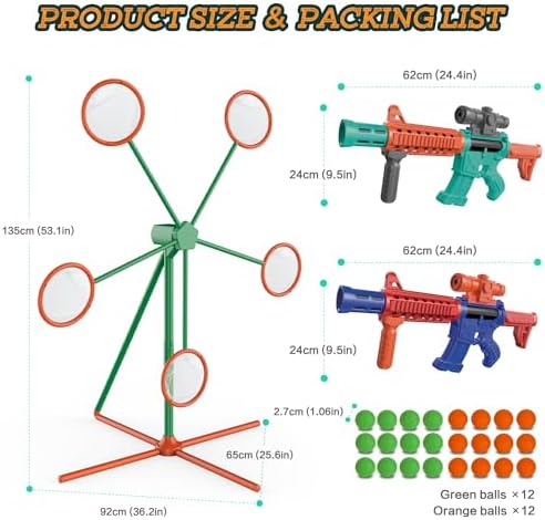 About Popper Air Toy Guns & Target – Cool and realistic shape design, and perfect color matching. The self-rotating pinwheel target reaches a height of 53.1 inch (135 cm). Popper air toy gun dimensions length 24.4 inch * width 9.5 inch (62cm*24cm). So they are also a game toy suitable for adults and children together.