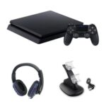 This PlayStation 4 Slim gaming bundle offers a complete setup for any gaming enthusiast. The centerpiece is the PS4 Slim console, a compact and sleek version of Sony’s iconic gaming system, designed for powerful performance in a streamlined, matte black form. Included with the console is a DualShock 4 wireless controller, featuring responsive buttons, a built-in touchpad, and motion-sensing technology to enhance gameplay with immersive precision. For a more connected experience, the bundle also comes with a gaming headset, a black over-ear design with blue accents, offering stereo sound and a built-in microphone for seamless in-game communication. Additionally, a dual charging dock is provided, allowing you to conveniently charge two controllers at once with the included USB cable. This bundle provides everything needed to fully enjoy the PS4 experience, from gaming to communication and quick charging.
