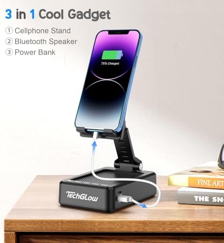【3 in 1 Multifunctional Gadget】Bluetooth Speaker + Phone Stand +Power Bank.This versatile device combines wireless Bluetooth speaker, portable charger and phone holder into a perfect tech gadget. It brings a lot of convenience for watching videos and making hands-free phone calls. It delivers stunning sound with enhanced bass, tight mids, and crystal clear highs without distortion at any volume.