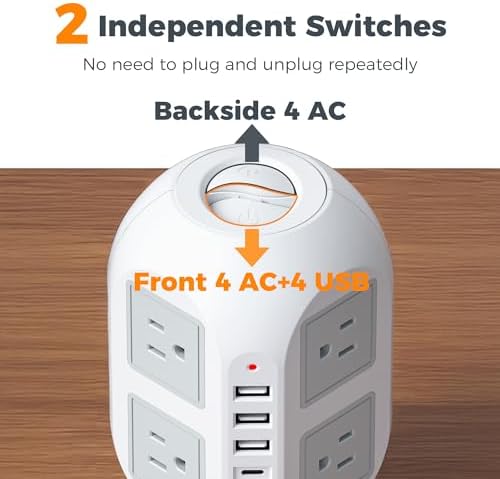 Tower Power Strip with Individual Switches: With 2 independent switches on the top, easy to manage power supply of devices, no need to plug and unplug repeatedly; NOTE: USB ports and the indicator light only activate via the switch directly above the USB ports. The size is 4.3×4.3×6.8inch, suitable for home, hotel, office, and college dorm room