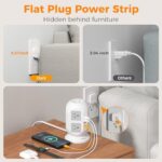 Flat Extension Cord 10Ft: With only 0.31 in ultra thin flat head design, flat plug power strip can easily fit in tight spots and hide behind sofa, bed, nightstand or other furniture, sitting flush against the wall; 45° right angle design create an extra space for other plug below without blocking
