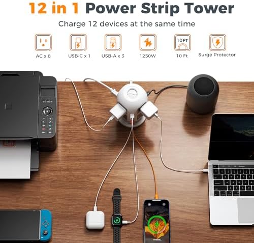 Equipped with 8 AC outlets, 1 USB-C and 2 USB-A ports, this power strip tower is ideal for phones, tablets, earphones, etc.