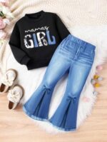 Back To School Season Kids Toddler Girl Clothes Long Sleeve Cartoon & Letter Graphic T-shirt Top + Fruit Stationery Print Flared Leg Pants For Fall Winter