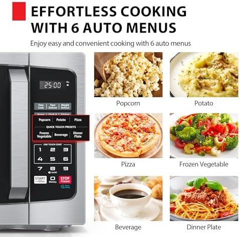 6 Preset Menus: This compact microwave features 6 preset menu options for popular foods like popcorn, pizza, potato and more.