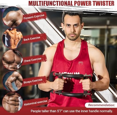 [CHEST EXERCISER FOR MEN] Our twister arm trainer for men & women has a unique two-stage adjustment function and is equipped with 2 sets (4 spring workout bars) with different resistance, which can form 30/60/90/120 pound four stage resistance exercise. Easily meet your diverse exercise needs. From basic warm-up, rehabilitation therapy to advanced muscle shaping, our twister arm exercise set that meets all your needs. Height above 5’7″ is required to exercise all actions of the inner handle.
