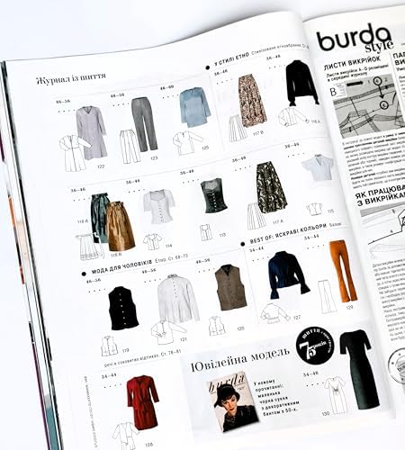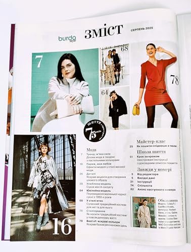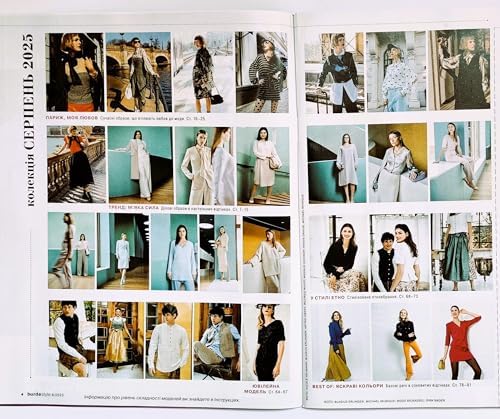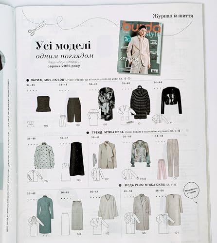 Ukrainian edition of Burda Style Magazine vol. 8 (August), 2025. ATTENTION: the Magazine is in the Ukrainian Language; the sewing pattern sheets inside are in German, English, Russian. The magazine offers templates for women sizes 34-48, Women Plus Size 46-60, Men 46-56. 82 pages.