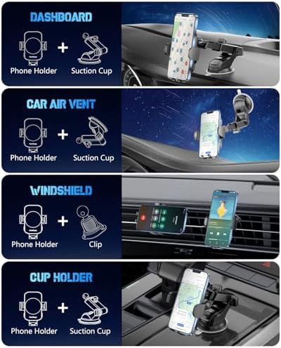 [3-in-1 Car Phone Holder]: The phone holder car is equipped with suction cups and ventilation clips, which can be freely installed on the windshield, dashboard and air vents to meet your different use needs. The cell phone mount is suitable for most cars, pickup trucks, SUVs, taxis. The assistant for Uber, Lyft drivers. Make it easier to charge your phone in the car