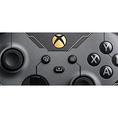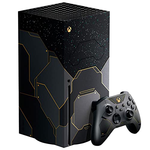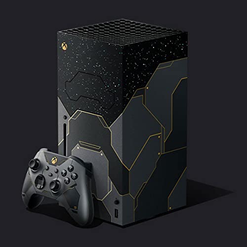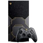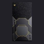 Includes a custom console design imprinted with stars as seen from the surface of Zeta Halo—extending onto the fan behind a Cortana blue vent. Inspired by the Master Chief’s armor, dark metallic paneling is accented by iridium gold on the console and its matching controller with side and back grips to accommodate all play styles.