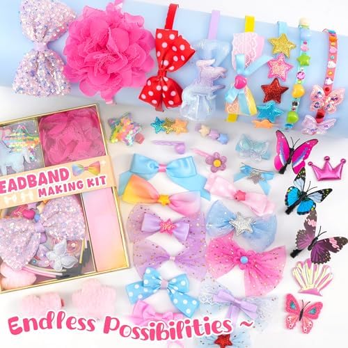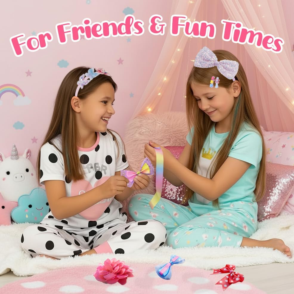 Super Value Pack: This girls hair accessories kit includes 8 headbands, 8 hair clips, 3 hair pins, 3 spring hair clips, 1 large flower, 1 glitter big bow, 19 ribbons, 39 lovely accessories (includes stars, butterflies, flowers, hearts etc.), 2 sheets gems stickers, 3 sheets glue dots, 1 bow maker, 1 manual, 1 gift box, 89pcs in total.