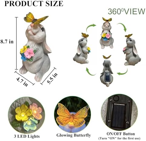 Yard Decorations Outdoor: Just turn on the switch of the solar garden decor and leave it on. Then place the rabbit decor anywhere in direct sunlight. The outdoor statues will be fully charged within 6-8 hours during the day and automatically light up for 8-10 hours at night. A perfect choice for yard art and garden accessories