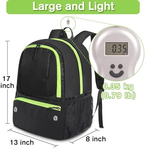 LARGE & LIGHTWEIGHT: Dimension: 13 x 8 x 17 (inches). The capacity of the soccer bag is 28 L, which is big enough to store all your soccer accessories. And its weight is only 0.79 pounds, equivalent to the weight of a can of soda. You can carry this soccer backpack easily. Whether rushing to the field or returning home tired after training, helps you take the burden off